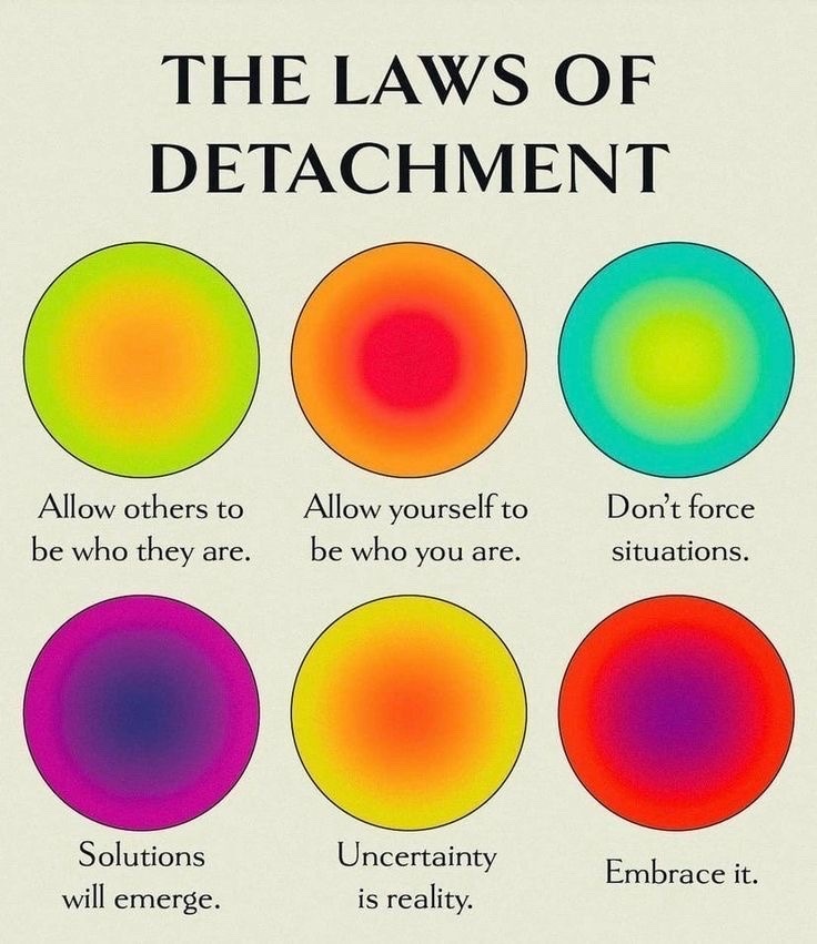 In relationships, detachment means accepting your partner as they are instead of trying to change them. It means allowing them to be themselves, trusting their process, and not imposing expectations. Practice compassion without being controlling. Focus on your own growth, becoming your best self, and trust that this self-work will attract the right relationships at the right time. Let go of anxiety of being single or finding “the one.” Trust in divine timing.